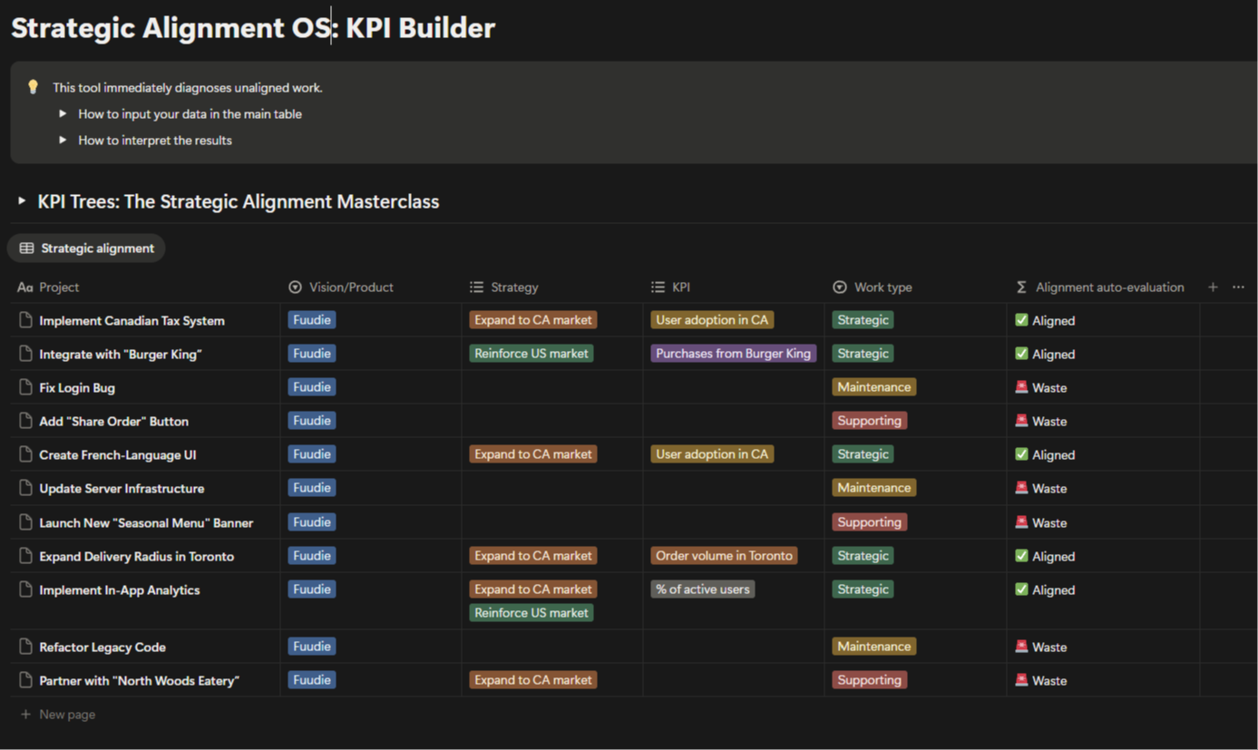 The Notion Strategic Alignment OS: Instantly diagnose every project that isn't driving your KPIs or serving your strategy. Built for leaders, not Notion experts.